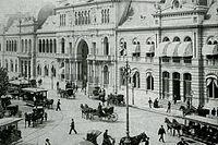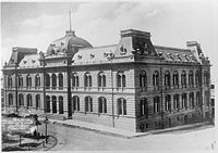 The old fort's administrative annex, which survived the construction of Taylor's Customs House, was enlisted as the Presidential offices by Bartolomé Mitre in the 1860s and his successor, Domingo Sarmiento, who beautified the drab building with patios, gardens and wrought-iron grillwork, had the exterior painted pink reportedly in order to defuse political tensions by mixing the red and white colors of the country's two opposing political parties: red was the color of the Federalists, while white was the color of the Unitarians.[3] An alternative explanation suggests that the original paint contained cow's blood to prevent damage from the effects of humidity. Sarmiento also authorized the construction of the Central Post Office next door in 1873, commissioning Swedish Argentine architect Carl Kihlberg, who designed this, one of the first of Buenos Aires' many examples of Second Empire architecture.[1]