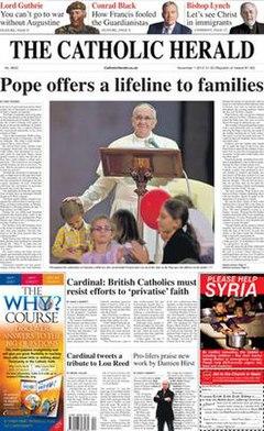 The Catholic Herald is a London-based Roman Catholic monthly newspaper and starting December 2014 a magazine, published in the United Kingdom, the Republic of Ireland and, formerly, the United States. It reports a total circulation of about 21,000 copies distributed to Roman Catholic parishes, wholesale outlets, and postal subscribers.