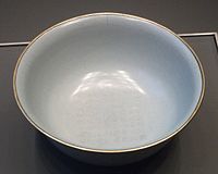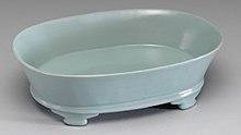 Celadon is a term for pottery denoting both wares glazed in the jade green celadon color, also known as greenware (the term specialists now tend to use[1]), and a type of transparent glaze, often with small cracks, that was first used on greenware, but later used on other porcelains. Celadon originated in China, though the term is purely European, and notable kilns such as the Longquan kiln in Zhejiang province are renowned for their celadon glazes.[2] Celadon production later spread to other parts of East Asia, such as Japan and Korea[3] as well as Southeast Asian countries such as Thailand. Eventually, European potteries produced some pieces, but it was never a major element there. Finer pieces are in porcelain, but both the color and the glaze can be produced in stoneware and earthenware. Most of the earlier Longquan celadon is on the border of stoneware and porcelain, meeting the Chinese but not the European definitions of porcelain.