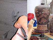 Chinese greenwares were very popular imports to Korea, and inspired local potters. Exceptional high-quality celadons were produced in Korea during the Goryeo and Joseon dynasties.[26] An inlaid greenware technique known as sanggam, where potters would engrave semi-dried pottery with designs and place black or white clay materials within the engraving, was invented in Korea during this time.[26][27][28]