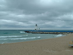 The Charlevoix South Pier Light Station is located on Lake Michigan at the entrance to Lake Charlevoix in Charlevoix County in the U.S. state of Michigan at the end of the south pier/breakwater of the channel leading to Round Lake in the city of Charlevoix.