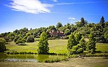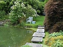 The gardens surrounding the house comprise 8 hectares (20 acres), with a further 23 hectares (57 acres) of parkland.[129] They are predominantly the creation of the Churchills, with significant later input from Lanning Roper, Gardens Adviser to the National Trust.[129] The Victorian garden had been planted with conifers and rhododendrons which were typical of the period.[88] The Churchills removed much of this planting, while retaining the woodlands beyond. Within the garden proper, they created almost all of the landscape, architectural and water features seen today.[88] The garden front of the house opens onto a terraced lawn, originally separated from the garden beyond by a ha-ha and subsequently by a Kentish ragstone wall constructed in the 1950s.[129] To the north lies the Rose garden, laid out by Lady Churchill and her cousin Venetia Stanley.[130] The nearby Marlborough Pavilion was built by Tilden and decorated with frescos by Churchill's nephew, John Spencer Churchill in 1949.[131] Beyond the Rose Garden is the Water Garden, constructed by the Churchills and including the Golden Orfe pond where Churchill fed his fish, and the swimming pool constructed in the 1930s. Churchill sought advice from his friend and scientific guru Professor Lindemann on the optimal methods for heating and cleaning the pool.[132]