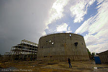 The turbine pit, which was a large irregularly-shaped structure, was modified to hold 2.2 million US gallons (8,300 m3) of water. But when cinematographer Al Giddings visited the site he found the potential tank was still not quite large enough for the production's needs. Cameron then investigated the original containment vessel for the reactor chamber, a cylindrical structure 200 feet (61 m) across, 55 feet (17 m) deep. Following modifications, this vessel was converted into a vat able to hold 7.5 million US gallons (28,000 m3) of water. This containment vessel became "A" tank while the smaller turbine pit was the "B" tank.