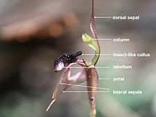 The flowers of wasp, ant and bird orchids are pollinated by sexual deception (pseudocopulation) of thynnine wasps, except for C. cornuta which is self-pollinating. A key feature is that each species of orchid is pollinated by a different species of wasp.[7]