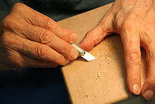 Chip carving or chip-carving, kerbschnitt in German, is a style of carving in which knives or chisels are used to remove small chips of the material from a flat surface in a single piece. The style became important in Migration Period metalwork, mainly animal style jewellery, where the faceted surfaces created caught the light to give a glinting appearance. This was very probably a transfer to metalworking of a technique already used in woodcarving, but no wooden examples have survived. Famous Anglo-Saxon examples include the jewellery from Sutton Hoo and the Tassilo Chalice, though the style originated in mainland Europe. In later British and Irish metalwork, the same style was imitated using casting, which is often called imitation chip-carving, or sometimes just chip carving (authors are not always careful to distinguish the two), a term also sometimes applied to pottery decorated in a similar way.