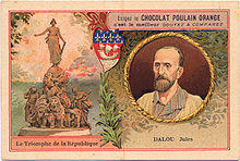 Victor-Auguste Poulain began the mass production of chocolate in 1848 in Blois, France,[2][1] before forming a limited company in 1893. He believed that a commercial future in chocolate would be found by selling to the masses and was innovative in industrialising the production of chocolate and in widespread marketing campaigns targeting children and families. In 1975, Chocolat Poulain was the sponsor of the mountains classification in the Tour de France when its distinctive polka jersey was introduced; the jersey's design was based on their chocolate bars that were covered in a polka dot wrapper.[3]