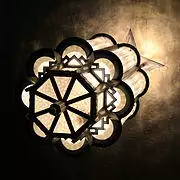 The Chrysler Building is renowned for, and recognized by, its terraced crown, which is an extension of the main tower.[160] Composed of seven radiating terraced arches, Van Alen's design of the crown is a cruciform groin vault of seven concentric members with transitioning setbacks, mounted one behind another.[57][165] The entire crown is clad with Nirosta steel, ribbed and riveted in a radiating sunburst pattern with many triangular vaulted windows, reminiscent of the spokes of a wheel.[57][36][166] The windows are repeated, in smaller form, on the terraced crown's seven narrow setbacks.[36][166] Due to the curved shape of the dome, the Nirosta sheets had to be measured on site, so most of the work was carried out in workshops on the building's 67th and 75th floors.[27] According to Robinson, the terraced crown "continue[s] the wedding-cake layering of the building itself. This concept is carried forward from the 61st floor, whose eagle gargoyles echo the treatment of the 31st, to the spire, which extends the concept of 'higher and narrower' forward to infinite height and infinitesimal width. This unique treatment emphasizes the building's height, giving it an other worldly atmosphere reminiscent of the fantastic architecture of Coney Island or the Far East."[160]