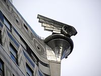 From late 1928 to early 1929, modifications to the design of the dome continued.[38] In March 1929, the press published details of an "artistic dome" that had the shape of a giant thirty-pointed star, which would be crowned by a sculpture five meters high.[63][36][64] The final design of the dome included several arches and triangular windows.[38] Lower down, the design was affected by Walter Chrysler's intention to make the building the Chrysler Corporation's headquarters, and as such, various architectural details were modeled after Chrysler automobile products, such as the hood ornaments of the Plymouth (see § Designs between setbacks).[36][8] The building's gargoyles on the 31st floor and the eagles on the 61st floor, were created to represent flight,[65] and to embody the machine age of the time.[36][8] Even the topmost needle was built using a process similar to one Chrysler used to manufacture his cars, with precise "hand craftmanship".[66] In his autobiography, Chrysler says he suggested that his building be taller than the Eiffel Tower.[67][9]