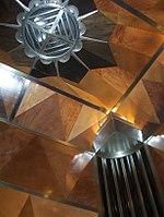 Above the third setback, consisting of the 24th through 27th floors, the facade contains horizontal bands and zigzagged gray-and-black brick motifs. The section above the fourth setback, between the 27th and 31st floors, serves as a podium for the main shaft of the building.[35][155] At each corner of the 31st floor, large car-hood ornaments made of Nirosta steel serve as visually striking objects that make the base look larger. These corner extensions help counter a common optical illusion seen in tall buildings with horizontal bands, whose taller floors would normally look larger.[160][161] The 31st floor also contains a gray and white frieze of hubcaps and fenders,[57][5] which symbolizes both the Chrysler Corporation and serves as a visual signature of the building's Art Deco design.[8][36][57] The bonnet embellishments take the shape of Mercury's winged helmet and resemble hood ornaments installed on Chrysler vehicles at the time.[161]