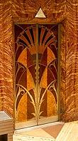 The triangular lobby[173][174][162] is regarded as a paragon of the Art Deco style, with clear influences of German Expressionism.[5] Chrysler wanted the design to impress other architects and automobile magnates, so he imported various materials without giving consideration to the extra costs incurred.[175] He covered the walls with huge slabs of African red granite.[175][99] On the floor, he marked a path from the entrances to the elevators using travertine from Siena.[176][174][177] Originally, Van Alen's plans for the lobby included four large supporting columns, but they were removed after Chrysler objected on the grounds that the columns made the lobby appear "cramped".[174] Opposite the main entrance is a security guard's desk topped by a digital clock.[177]