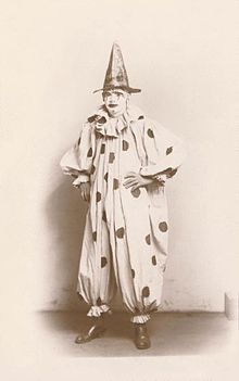 Canio, the tenor protagonist of Ruggiero Leoncavallo's famous tragic opera Pagliacci, is usually garbed on stage as the whiteface variety of clown. In this particular instance, he is a representative of the stock fictional character of the clown (or jester) who laughs on the outside, but is secretly crying on the inside due to a grievance or a depressed state of mind.