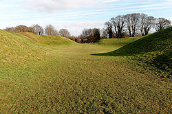 The Roman amphitheatre still exists in an area known as the Querns to the south-west of the town, but has only been partially excavated. Investigations in the town show that it was fortified in the 5th or 6th centuries. Andrew Breeze argued that Gildas received his later education in Cirencester in the early 6th century, showing that it was still able to provide an education in Latin rhetoric and law at that time.[6] Possibly this was the palace of one of the British kings defeated by Ceawlin in 577. It was later the scene of the Battle of Cirencester, this time between the Mercian king Penda and the West Saxon kings Cynegils and Cwichelm in 628.[7]