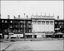 Following a fire, an order was made with little warning for the destruction of the Palace Bingo Hall (née Theatre) in 1977. Staff of the Citizens arranged a stay of execution to rescue the best of the Victorian fittings, including the six statues which stood atop the columns.[24] Following these works, almost the entire tenement block which had sat in front of the auditorium was razed, leaving the Citizens' foyer as the only remaining piece[25] In an article for the Guardian newspaper, Bunny Christie described the theatre in this period as "[sitting] on its own, surrounded by potholes and puddles, everything else seemed to have been pulled down." [26]