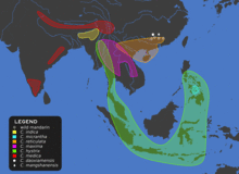 Citrus plants are native to subtropical and tropical regions of Asia, Island Southeast Asia, Near Oceania, and northeastern Australia. Domestication of citrus species involved much hybridization and introgression, leaving much uncertainty about when and where domestication first happened.[2] A genomic, phylogenic, and biogeographical analysis by Wu et al. (2018) has shown that the center of origin of the genus Citrus is likely the southeast foothills of the Himalayas, in a region stretching from eastern Assam, northern Myanmar, to western Yunnan. It diverged from a common ancestor with Poncirus trifoliata. A change in climate conditions during the Late Miocene (11.63 to 5.33 mya) resulted in a sudden speciation event. The species resulting from this event include the citrons (Citrus medica) of South Asia; the pomelos (C. maxima) of Mainland Southeast Asia; the mandarins (C. reticulata), kumquats (C. japonica), mangshanyegan (C. mangshanensis), and ichang papedas (C. cavaleriei) of southeastern China; the kaffir limes (C. hystrix) of Island Southeast Asia; and the biasong and samuyao (C. micrantha) of the Philippines.[2][3]
