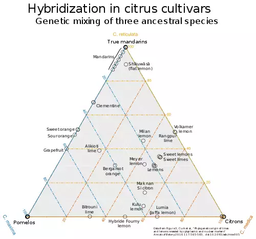 - ^ Curk, Franck; Ollitrault, Frédérique; Garcia-Lor, Andres; Luro, François; Navarro, Luis; Ollitrault, Patrick (2016). "Phylogenetic origin of limes and lemons revealed by cytoplasmic and nuclear markers". Annals of Botany. 11 (4): 565–583. doi:10.1093/aob/mcw005. PMC 4817432. PMID 26944784.