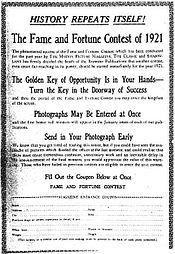 Against her mother's wishes but with her father's support, Bow competed in Brewster publications' magazine's annual nationwide acting contest, "Fame and Fortune", in fall 1921. In previous years, other contest winners had found work in the movies.[36] In the contest's final screen test, Bow was up against an already scene-experienced woman who did "a beautiful piece of acting". A set member later stated that when Bow did the scene, she actually became her character and "lived it".[37] In the January issues 1922 of Motion Picture Classics, the contest jury, Howard Chandler Christy, Neysa McMein, and Harrison Fisher, concluded: