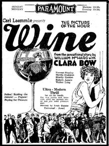 Loaned out to Universal, Bow top-starred, for the first time, in the prohibition, bootleg drama/comedy Wine, released on August 20, 1924. The picture exposes the widespread liquor traffic in the upper classes, and Bow portrays an innocent girl who develops into a wild "red-hot mama".