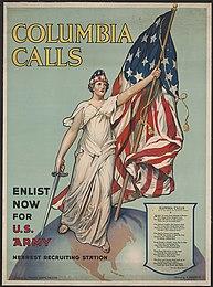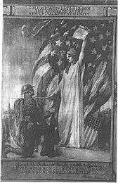 Early in World War I (1914–1918), the image of Columbia standing over a kneeling "Doughboy" was issued in lieu of the Purple Heart medal. She gave "to her son the accolade of the new chivalry of humanity" for injuries sustained in "the" World War.