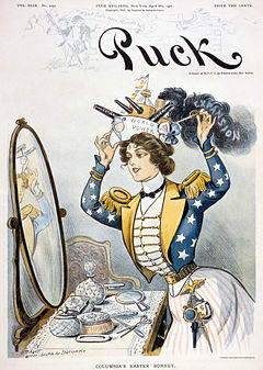 Especially in the 19th century, Columbia was visualized as a goddess-like female national personification of the United States and of liberty itself, comparable to the British Britannia, the Italian Italia Turrita and the French Marianne, often seen in political cartoons of the 19th and early 20th century. The personification was sometimes called Lady Columbia or Miss Columbia. Such an iconography usually personified America in the form of an Indian queen or Native American princess.[13]