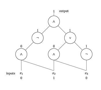 Formally, a Boolean circuit is a directed acyclic graph in which edges represent wires (which carry the bit values 0 and 1), the input bits are represented by source vertices (vertices with no incoming edges), and all non-source vertices represent logic gates (generally the AND, OR, and NOT gates). One logic gate is designated the output gate, and represents the end of the computation. The input/output behavior of a circuit with input variables is represented by the Boolean function ; for example, on input bits , the output bit of the circuit is represented mathematically as . The circuit is said to compute the Boolean function .