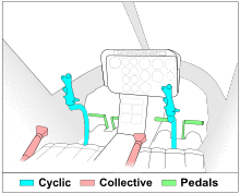 A helicopter has four flight control inputs. These are the cyclic, the collective, the anti-torque pedals, and the throttle. The cyclic control is usually located between the pilot's legs and is commonly called the cyclic stick or just cyclic. On most helicopters, the cyclic is similar to a joystick. However, the Robinson R22 and Robinson R44 have a unique teetering bar cyclic control system and a few helicopters have a cyclic control that descends into the cockpit from overhead.
