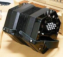 The bandoneon (also rendered bandoneón, bandonion) is a German concertina system with an original bisonoric layout devised by Heinrich Band. Although intended as a substitute for the organ in small churches and chapels, it was soon secularized and is now associated with tango music, due to the instrument's popularity in Argentina since the late 19th century when tango developed from various dance styles in Argentina and Uruguay.[7] Though the typical bandoneon is bisonoric, the 1920s saw the development of unisonoric variants such as the Ernst Kusserow and Charles Peguri systems, both introduced around 1925.[8]:18[9] Bandoneons typically have more than one reed per button, dry-tuned with the reeds an octave apart. "Dry" means that vibrato is absent because the tuning is accurate.[8]:18 The instrument is considered an essential part of the Argentine tango orchestra.