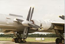 In the 1980s, Kuznetsov continued to develop powerful contra-rotating engines. The NK-110, which was tested in the late 1980s, had a contra-rotating propeller configuration with four blades in front and four in back, like the NK-12. Its 190-inch propeller diameter (4.7-metre) was smaller than the NK-12's 220–240 in (5.6–6.2 m) diameter, but it produced a power output of 21,007 hp (15,665 kW), delivering a takeoff thrust of 40,000 pounds-force (177 kilonewtons).[12] Even more powerful was the NK-62, which was in development throughout most of the decade. The NK-62 had an identical propeller diameter and blade configuration to the NK-110, but it offered a higher takeoff thrust of 55,000 lbf (245 kN). The associated NK-62M had a takeoff thrust of 64,100 lbf (285.2 kN), and it could deliver 70,700 lbf (314.7 kN) of emergency thrust.[13] Unlike the NK-12, however, these later engines were not adopted by any of the aircraft design bureaus.