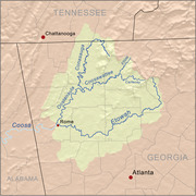 Near New Echota, a late capital of the Cherokee Nation (1794-1907 before removal in 1838, the Coosawattee meets the Conasauga River. They form the Oostanaula River, a tributary of the Coosa River.[4]