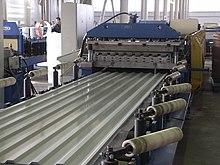 Today the corrugation process is carried out using the process of roll forming. This modern process is highly automated to achieve high productivity and low costs associated with labour. In the corrugation process sheet metal is pulled off huge rolls and through rolling dies that form the corrugation. After the sheet metal passes through the rollers it is automatically sheared off at a desired length. The traditional shape of corrugated material is the round wavy style, but different dies form a variety of shapes and sizes. Industrial buildings are often built with and covered by trapezoidal sheet metal.