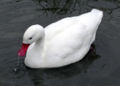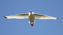 Male coscoroba swans weigh 3.8–5.4 kg (8.4–11.9 lb) and females weigh 3.2–4.5 kg (7.1–9.9 lb). The length is from 87.5 to 115 cm (34.4 to 45.3 in) and the wingspan is 155 to 160 cm (61 to 63 in).[3] They have white plumage except for black tips to the outer six primary feathers, although this black is often barely visible on the closed wing. In flight, the black wing tips are conspicuous. The bird has a red beak, legs and feet. They look somewhat more like geese than swans. The female looks almost identical to the male. The cygnet is a patchy color, with brown and gray hues. The coscoroba swan lacks the patch of bare skin between the eyes and beak typical of swans. They look like a very small swan in body and look like a goose in the head. Eggs measure 89 X 61 mm, with averages of 82 to 94 53 to 67 mm, with an average weight of 170 grams and range from 129 to 203 grams