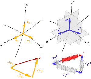 Curvilinear coordinate systems, such as cylindrical or spherical coordinates, are often used in physical and geometric problems. Associated with any coordinate system is a natural choice of coordinate basis for vectors based at each point of the space, and covariance and contravariance are particularly important for understanding how the coordinate description of a vector changes by passing from one coordinate system to another.