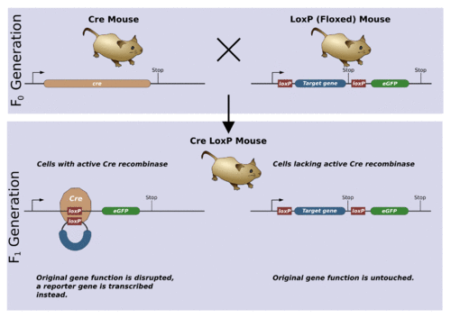 Cre-Lox recombination is a special type of site-specific recombination developed by Dr. Brian Sauer and patented by DuPont that operated in both mitotic and non-mitotic cells, and was initially used in activating gene expression in mammalian cell lines.[2][3][4] Subsequently, researchers in the laboratory of Dr. Jamey Marth demonstrated that Cre-Lox recombination could be used to delete loxP-flanked chromosomal DNA sequences at high efficiency in specific developing T-cells of transgenic animals, with the authors proposing that this approach could be used to define endogenous gene function in specific cell types, indelibly mark progenitors in cell fate determination studies, induce specific chromosomal rearrangements for biological and disease modeling, and determine the roles of early genetic lesions in disease (and phenotype) maintenance.[5]