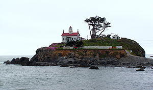 The area that is now known as Del Norte County[13] was and still is inhabited by the Yurok (Klamath River Indians) and Tolowa Nations of indigenous peoples. The first European American to explore this land was pioneer Jedediah Smith in the early 19th century. He was the first European American to reach the area overland on foot in a time before the European Americans knew anything about such a distant territory. For him it was literally "Land's End" — where the American continent ended at the Pacific Ocean. In 1855 Congress authorized the building of a lighthouse at "the battery point" (a high tide island on the coast of Crescent City) which is still functioning as a historical landmark.[14]