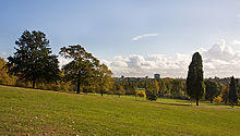 Gladstone Park marks the north-western edge, covering approximately 35 hectares (86 acres). In 2003-04, Gladstone Park features and facilities were improved/restored with the aid of Heritage Lottery funding. The park contains a well maintained formal garden, children's playground, art gallery, café and pond, as well as good sport facilities (football/rugby/cricket pitches and tennis and netball courts).[7] Barring fog and rain its peak gives good views of Wembley Stadium, the London Eye and the Shard. The park was frequented by Mark Twain around the turn of the 20th century whilst staying in accompanying Dollis Hill House, about which altogether he said he had "never seen any place that was so satisfactorily situated, with its noble trees and stretch of country, and everything that went to make life delightful, and all within a biscuit's throw of the metropolis of the world".