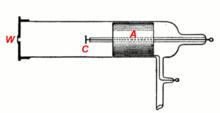 A Crookes tube (also Crookes–Hittorf tube)[1] is an early experimental electrical discharge tube, with partial vacuum, invented by English physicist William Crookes[2] and others around 1869-1875,[3] in which cathode rays, streams of electrons, were discovered.[4]