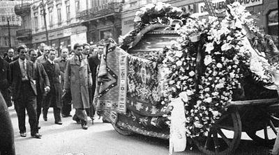 Stelescu himself already expected to be assassinated by the Codrenists, and repeatedly taunted his adversaries, instructing them to shoot him, but "not in the back".[30] In July 1936, while recovering at the Brâncovenesc Hospital, where he had undergone an appendectomy, Stelescu fell victim to the Guard's revenge. A Decemviri death squad, comprising ten Theology students,[31] had formally received Codreanu's blessing at the Iron Guard Congress in Târgu Mureș that April.[32] Seizing its opportunity, it stormed into the hospital building and shot Stelescu to death. This murder left an enduring mark on public memory because of its ritualistic nature: Stelescu's body was not just riddled with bullets, but also bludgeoned or hacked to pieces.[33]