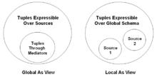 A database over a schema is defined as a set of sets, one for each relation (in a relational database). The database corresponding to the source schema would comprise the set of sets of tuples for each of the heterogeneous data sources and is called the source database. Note that this single source database may actually represent a collection of disconnected databases. The database corresponding to the virtual mediated schema is called the global database. The global database must satisfy the mapping with respect to the source database. The legality of this mapping depends on the nature of the correspondence between and . Two popular ways to model this correspondence exist: Global as View or GAV and Local as View or LAV.