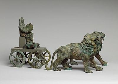 Roman bystanders seem to have perceived Megalesia as either characteristically "Greek";[63] or Phrygian. At the cusp of Rome's transition to Empire, the Greek Dionysius of Halicarnassus describes this procession as wild Phrygian "mummery" and "fabulous clap-trap", in contrast to the Megalesian sacrifices and games, carried out in what he admires as a dignified "traditional Roman" manner; Dionysius also applauds the wisdom of Roman religious law, which forbids the participation of any Roman citizen in the procession, and in the goddess's mysteries;[64] Slaves are forbidden to witness any of this.[65] In the late republican era, Lucretius vividly describes the procession's armed "war dancers" in their three-plumed helmets, clashing their shields together, bronze on bronze,[66] "delighted by blood"; yellow-robed, long-haired, perfumed Galli waving their knives, wild music of thrumming tympanons and shrill flutes. Along the route, rose petals are scattered, and clouds of incense arise.[67] The goddess's image, wearing the Mural Crown and seated within a sculpted, lion-drawn chariot, is carried high on a bier.[68] The Roman display of Cybele's Megalesia procession as an exotic, privileged public pageant offers signal contrast to what is known of the private, socially inclusive Phrygian-Greek mysteries on which it was based.[69]