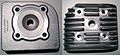 The bottom (left) and top (right) of a Malossi cylinder head for single-cylinder, two-stroke scooters. Hole in the middle for the spark plug, four holes for the cylinder bolt posts.