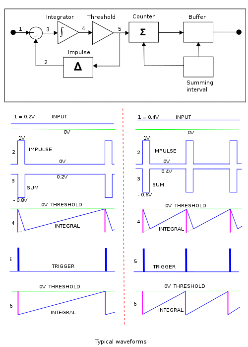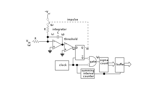 A delta-sigma or other pulse-density or pulse-frequency modulator generates a pulse stream in which the frequency, f, of pulses in the stream is proportional to the analog voltage input, v, so that f = k · v, where k is a constant for the particular implementation. A feedback loop monitors the integral of v and when that integral has incremented by Δ, which is indicated by the integral waveform crossing a threshold, T, it subtracts Δ from the integral of v so that the combined waveform sawtooths between T and T − Δ. At each step a pulse is added to the pulse stream.