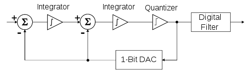 In a conventional ADC, an analog signal is sampled with a sampling frequency and subsequently quantized in a multi-level quantizer into a digital signal. This process introduces quantization error noise. The first step in a delta-sigma modulation is delta modulation. In delta modulation the change in the signal (its delta) is encoded, rather than the absolute value. The result is a stream of pulses, as opposed to a stream of numbers as is the case with pulse-code modulation (PCM). In delta-sigma modulation, accuracy of the modulation is improved by passing the digital output through a 1-bit DAC and adding (sigma) the resulting analog signal to the input signal (the signal before delta modulation), thereby reducing the error introduced by the delta modulation.