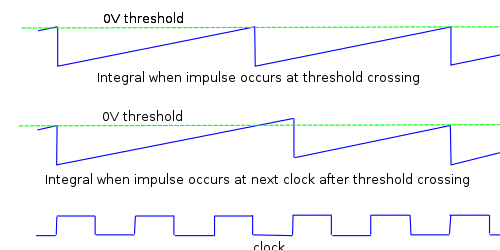 Delta-sigma converters further constrain operation of the impulse generator such that the start of the impulse is delayed until the next occurrence of the appropriate clock-pulse boundary. The effect of this delay is illustrated in Figure 1a for a sequence of impulses which occur at a nominal 2.5 clock intervals.