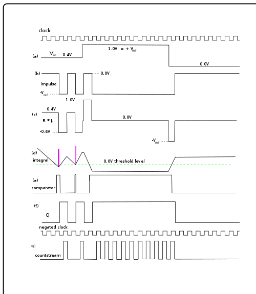Examination of Figure 1c(g) shows that there are zero pulses in the countstream when the input voltage is zero. This condition can have the effect that high-frequency components of a complex signal are not resolved. This effect is known as intermodulation distortion (IMD). One of the pitfalls of applying linear analysis to a nonlinear system is that IMD, because it can be a consequence of nonlinearity, is not present in the analysis. Purely for illustrative purposes, a method to mitigate this would be to add an 0.5 volt constant bias to the input voltage so the it now can swing +/− 0.5 V about the bias. This now has zero pulses in the countstream when the input is −0.5 V. Then we must limit the input swing to +/− 0.4 V, say, so that the minimum countstream frequency is greater than zero. We can choose the clock frequency so that the minimum countstream frequency at −0.4 V is much greater than the Nyquist rate, so that even the highest input frequency component is resolved. We can increase the clock frequency still higher until a lowpass filter sufficiently removes the pulsations while fully recovering the input signal. In this illustrative discussion the filtered signal will also recover the bias which can be removed by an analogue adder, while still retaining the DC component of the input signal.