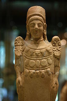 The earliest recorded worship of a deity possibly equivalent to Demeter is found in Linear B Mycenean Greek tablets of c. 1400–1200 BC found at Pylos. The tablets describe worship of the "two queens and the king",[53] which may be related to Demeter, Persephone and Poseidon.[4] An early name which may refer to Demeter, si-to-po-ti-ni-ja (Sito Potnia), appears in Linear B inscriptions found at Mycenae and Pylos.[54] In Crete, Poseidon was often given the title wa-na-ka (wanax) in Linear B inscriptions, in his role as king of the underworld, and his title E-ne-si-da-o-ne indicates his chthonic nature. In the cave of Amnisos, Enesidaon is associated with the cult of Eileithyia, the goddess of childbirth,[55] who was involved with the annual birth of the divine child.[56] During the Bronze Age, a goddess of nature dominated both in Minoan and Mycenean cults, and Wanax (wa-na-ka) was her male companion (paredros) in the Mycenean cult.[55] Elements of this early form of worship survived in the Eleusinian cult, where the following words were uttered: "the mighty Potnia had born a strong son."[57]