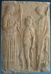 Before her abduction by Hades, Persephone was known as Kore ("maiden"), and there is some evidence that the figures of Persephone Queen of the Underworld and Kore daughter of Demeter were originally considered separate goddesses.[73] However, they must have become conflated with each other by the time of Hesiod in the 7th century BC.[68] Demeter and Persephone were often worshiped together and were often referred to by joint cultic titles. In their cult at Eleusis, they were referred to simply as "the goddesses", often distinguished as "the older" and "the younger"; in Rhodes and Sparta, they were worshiped as "the Demeters"; in the Thesmophoria, they were known as "the thesmophoroi" ("the legislators").[74] In Arcadia they were known as "the Great Goddesses" and "the mistresses". In Mycenaean Pylos, Demeter and Persephone were probably called the "queens" (wa-na-ssoi).[53]