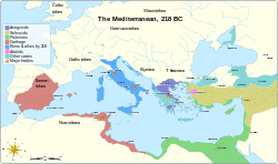 Philip was easily convinced and followed Demetrius' advice.[31] Evidence of Demetrius' influence can be seen in the treaty of alliance between Philip and Hannibal of 215 BC. One of its articles specified that any peace made with Rome would include as terms that the Romans would relinquish control of Corcyra, Apollonia, Epidamnus, Pharos, Dimale, Parthini, and Atintania and to restore to Demetrius of Pharos all those of his territories now in the dominion of Rome.[32] In 217 BC Philip made war against Scerdilaidas, to recover some territory recently lost and to expand his control westward. Polybius gives as Philip's (and Demetrius') motives that: