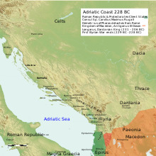 After returning to the Ardiaean Kingdom, Demetrius continued operations during the following winter, attacking and seizing Roman allied cities and communities in southern Illyria.[19] The Romans who hitherto ignored the activities of their former ally, decided that the harbors on the coast of the Ardiaean Kingdom had now to be made secure, in view of the threat of another war with Carthage.[20] These events precipitated the Second Illyrian War.