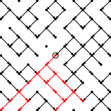 One of the simplest realizations of DP is bond directed percolation. This model is a directed variant of ordinary (isotropic) percolation and can be introduced as follows. The figure shows a tilted square lattice with bonds connecting neighboring sites. The bonds are permeable (open) with probability and impermeable (closed) otherwise. The sites and bonds may be interpreted as holes and randomly distributed channels of a porous medium.
