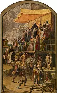In the 15th century, the Spanish Inquisition commissioned the artist Pedro Berruguete to depict Dominic presiding at an auto da fé. Thus, the Spanish inquisitors promoted a historical legend for the sake of auto-justification.[39] Reacting against the Spanish tribunals, 16th- and 17th-century Protestant polemicists gladly developed and perpetuated the legend of Dominic the Inquisitor.[40] This image gave German Protestant critics of the Catholic Church an argument against the Dominican Order whose preaching had proven to be a formidable opponent in the lands of the Reformation.[41] As Edward Peters notes, "In Protestant historiography of the sixteenth century a kind of anti-cult of St. Dominic grew up."[40]
