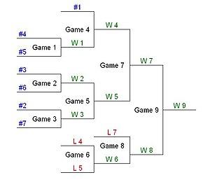 - Playoffs – a variation of the single-elimination tournament where instead of one win, a team needs to win a specific number of games in a series in order to advance.
